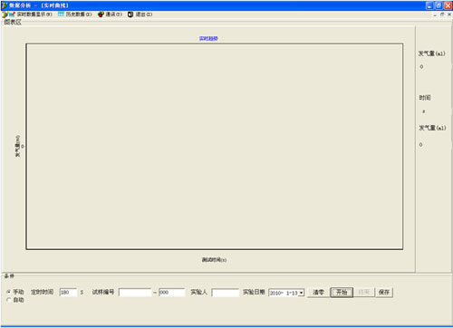 首先通過勾選“手動(dòng)”、“自動(dòng)”前的可選項(xiàng),使相應(yīng)項(xiàng)前出現(xiàn)“.”,從而選擇手動(dòng)或自動(dòng)。畫面右側(cè)上方的“發(fā)氣量(ml)”顯示值為實(shí)時(shí)測試數(shù)據(jù),下方的“時(shí)間”、“發(fā)氣量(ml)顯示值為拖動(dòng)游標(biāo)所指示點(diǎn)的相應(yīng)數(shù)據(jù)。